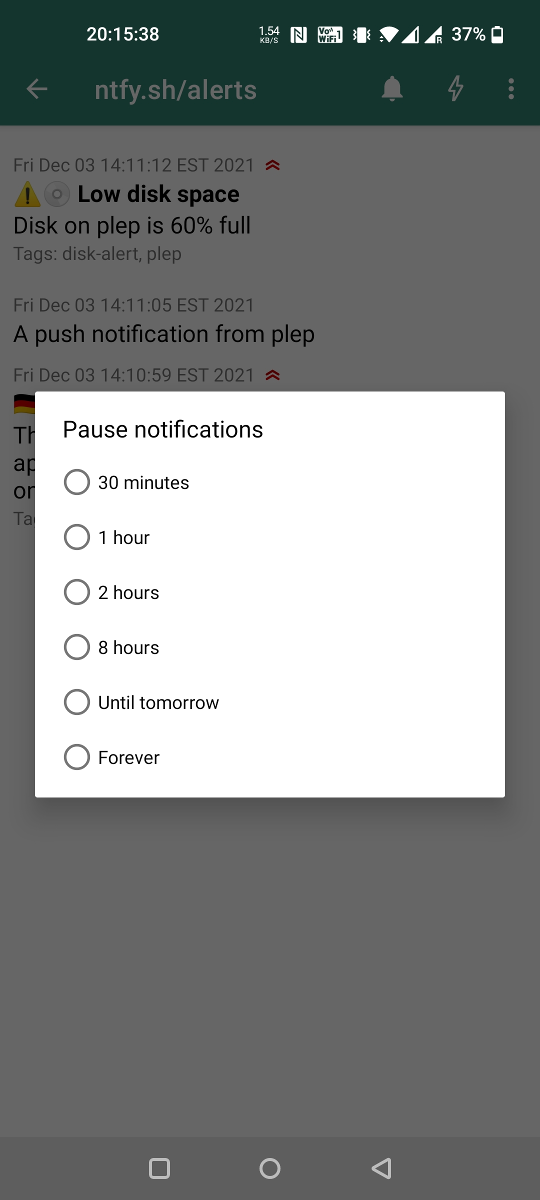 You can use the ntfy Android App to receive notifications directly on your phone. Just like the server, this app is also open source. Since I don't have an iPhone or a Mac, I didn't make an iOS app yet. I'd be awesome if someone else could help out.